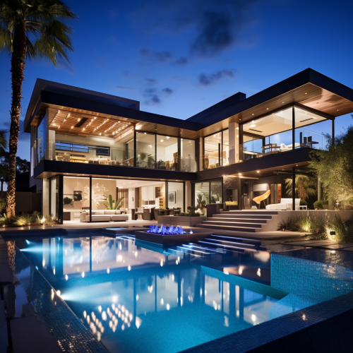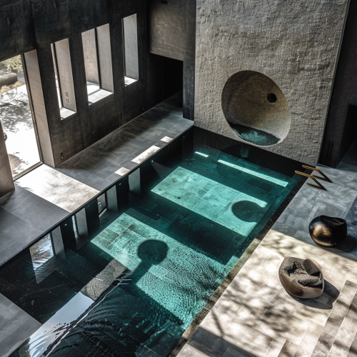 an indoor swimming pool in an aerial view of a black innovative house, in the style of isaac julien, organic stone carvings, 32k uhd, desertwave, minimalist sets, poolcore, rustic futurism, in california, minimalist, luxury