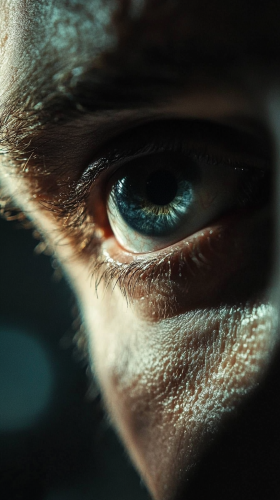 STYLE: Cinematic Close-Up | GENRE: historical drama | EMOTION: fear, uncertainty | SCENE: A close-up of a customer’s face as he awaits the blade’s descent, his eyes wide with apprehension. The faint sound of the whirring machine adds to the suspense as he braces himself. | TAGS: 8k, dim lighting, emotional intensity, close-up of fear, immersive realism | TIME: Afternoon | LOCATION TYPE: Barbershop interior | CINEMATOGRAPHER: Emmanuel Lubezki | --ar 9:16