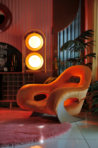 70s living room with Macintosh-inspired sleek lounge chair, high-key, --ar 2:3 --v 6.0