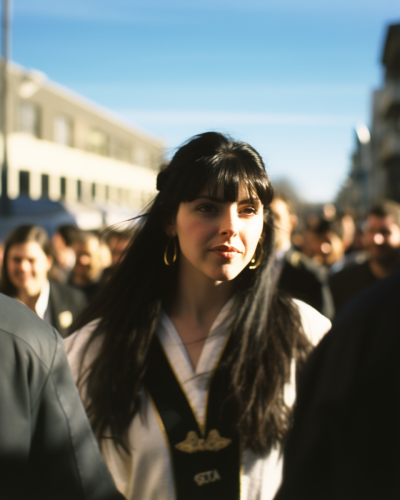 Hyperrealistic and highly detailed black and white portrait of a severe and tough 19th century queen, dressed and styled according to the fashion of the time. A a bumblebee is perched on her nose, showing us the top-down view of the symmetric bumblebee. Irving Penn style of photography. Focus on the extreme realism of the skin, highlighting visible pores, fine lines and the thin folds of the lips as the central elements of the image. Perfect image like a photo. The texture of the skin and the details are of paramount importance, shot on Hasselblad, with a 85mm lens --ar 3:4