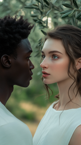 Real photo of a black sudanese young man facing a white brunette young woman, profile of head and shoulders, they are in love, they look into each other's eyes, modern clothes, clean sharp focus, depth of field, cinematic lighting, photo shot in the style of hasselblad h6d-400c, editorial photography. Plain olive tree wallpaper texture background, style raw, 8k, high resolution, --ar 9:16