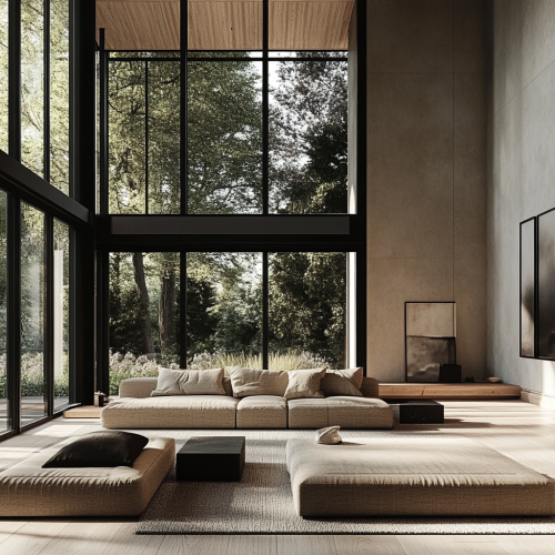 California-style bedroom interior, spacious and airy with large windows letting in abundant natural light. The room features high ceilings, warm neutral tones, and a blend of modern and coastal elements. A king-sized bed with soft linens, warm wood furniture, and minimalist decor create a luxurious, serene atmosphere.