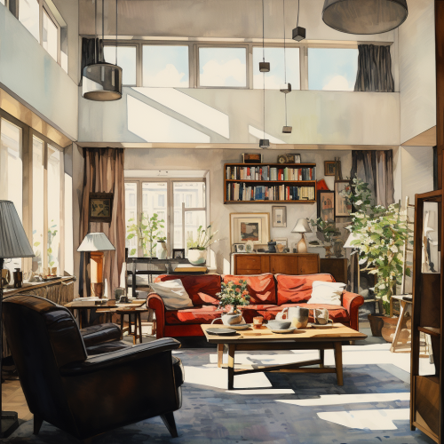 A large mid-century living room with arched windows, a fireplace, and couches, featuring rustic home decor. The room has wooden floors, a rustic chandelier, and warm lighting, creating a cozy atmosphere. The color palette is earthy, with greenery plants and a coffee table. In the background, there is a dining area with natural light. --ar 16:9 --v 6.1 --s 750