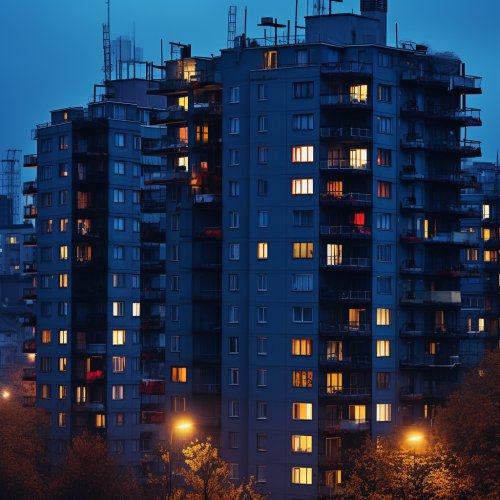 stacked neighborhood, tall trees on balconies, Ieoh Ming Pei style, colored trees, autumn, steel structure, dark pastel coloured family house, Yener Torun style ::Bluehour