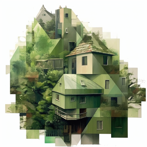 a green building without trees and vegetation made of collages and stacked houses with pitched roofs --s 750 --v 5.1