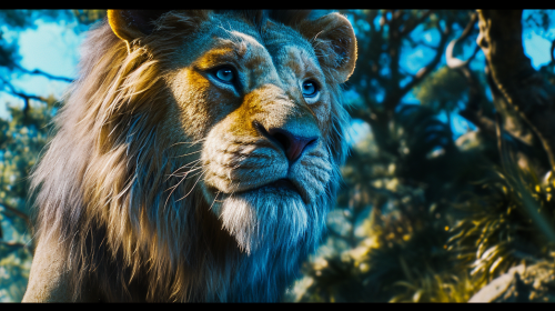 Wide-angle photography of Aslan from Narnia, Intense but kind blue eyes, Cinematic, Kodak Ektar, Colorful, Saturated, Technicolor, 2.5D, Ultra-HD, AMOLED, Hard Lighting, Ray Traced, Ray Tracing Ambient Occlusion, Anti-Aliasing, FXAA, RTX, SSAO, De-Noise, Tone Mapping, insanely detailed and intricate, hypermaximalist, elegant, ornate, hyper realistic, super detailed, --v 6.0 --ar 16:9 --style raw --s 50