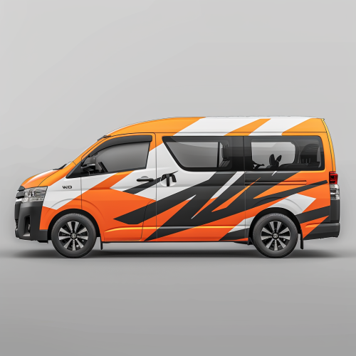Design a promotional artwork on a Toyota 6 seater vehicle using Bright Orange, grey and white color. create mix Colorful and a simple design. reserve white spaces for text inputs and company logos. --v 6.0