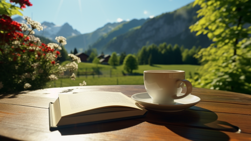 coffee and book outside in a swiss country side background, the alps, relaxing, Ultra-realistic, ultra-hd, 8k --ar 16:9 --v 5.2
