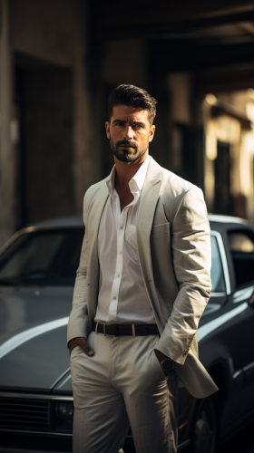 Footage of a man in classic attire( think the today's modern styles) in front of an typical 1990s car. in the artstyle of a photo taken with a Sony 75 mm lens and in a dramatic composition --ar 9:16 --s 300 --c 5 --style raw