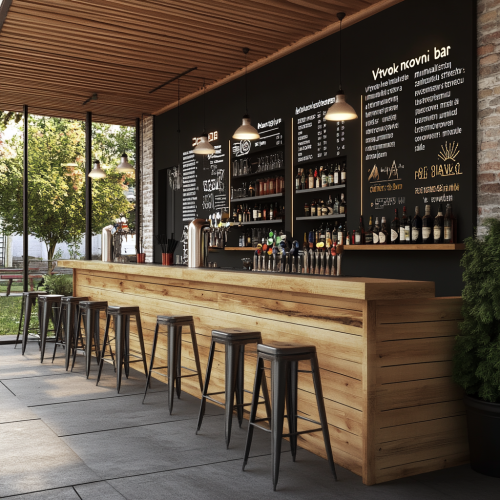 "Vytvoř moderní venkovní bar v zahradě s minimalistickým designem. Bar by měl mít rovnou střechu a otevřené strany, tmavé dřevěné panely a betonové pracovní desky. Před barem umísti čtyři černé kovové barové židle. Bar je osvětlený teplým LED osvětlením z vestavěných světel ve stropě. Za barem je gril a další barové vybavení s černým cihlovým obkladem na zdi a retro dekoracemi. Podlaha je z betonových dlaždic a jsou zde malé květináče jako dekorace. Celý prostor je umístěný v zelené zahradě, což vytváří útulnou a příjemnou atmosféru."