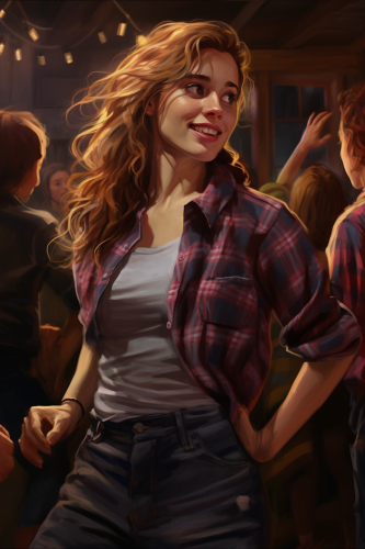 Hermione dressed in men's pants and flannel shirt dances in a 60's style country pub, twilight, bar in the background and a few people dancing, very detailed, ultra realistic, --ar 2:3