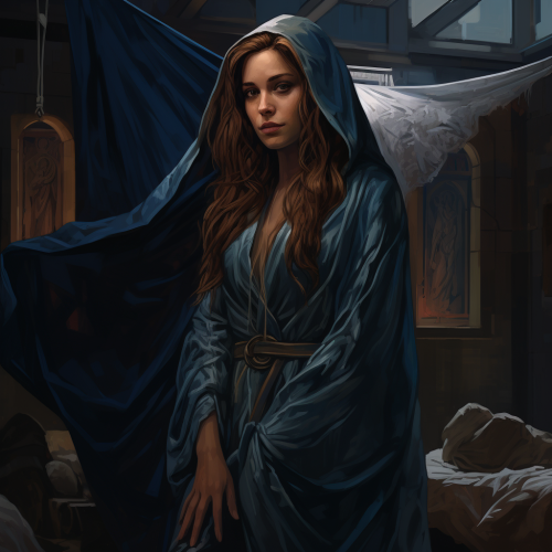 hospital ward watcher. A female Magic monk pulling down their hooded robe to reveal their face. The robe is made from ER blue scrubs material. The monk is has auburn hair.