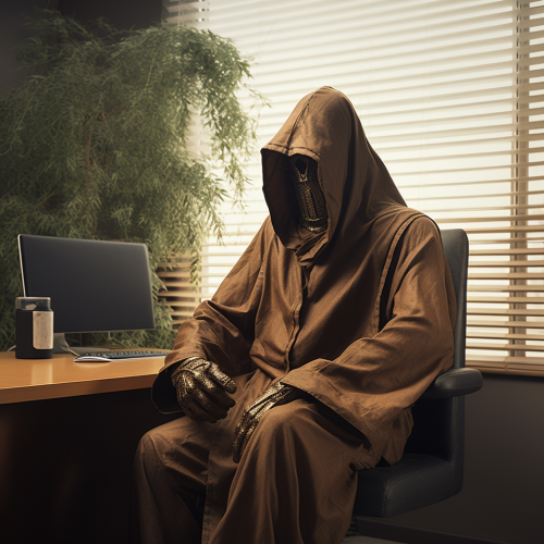 . A magic monk wearing a hooded robe at a job interview. The robe is made from ER scub material