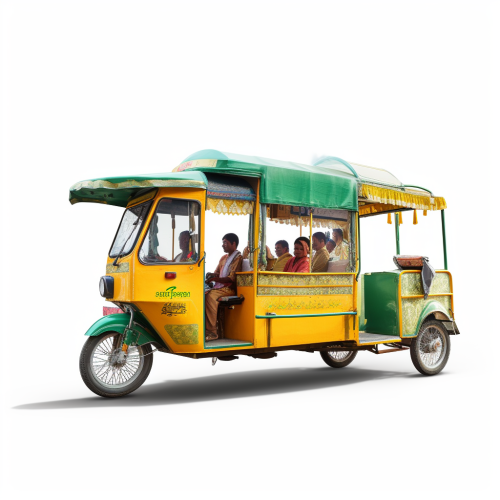 green - yellow moving e-rickshaw with indian people on it, side view on a white background, photorealistic