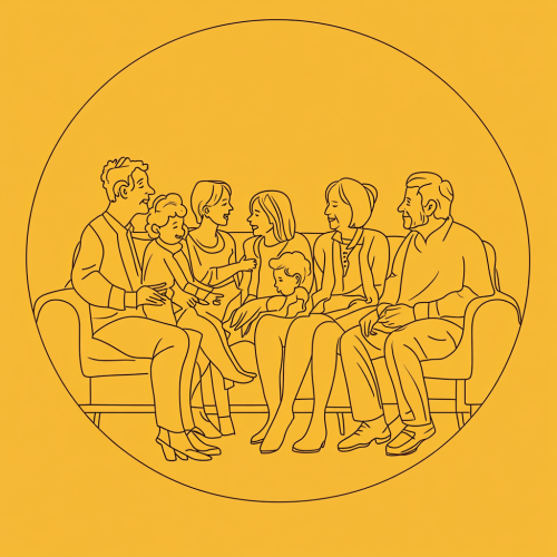line art of the family with elderly parents on sofa set enjoying and talking each other. line color mustard and the wrold Family is written on the back wall.
