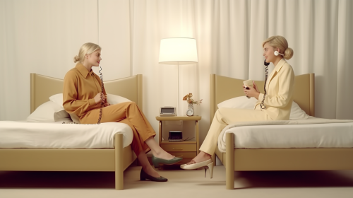 A standing hairdresser is talking on the phone, with a unhappy woman sitting in the chair in a well-lit room. The room should have minimal objects, and both individuals are dressed in stylish clothes. The setting is modern with a sleek design. The image should be photorealistic, high resolution --ar 19:12 --v 6.0 --stylize 750