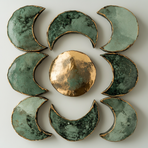 A series of ceramic pottery pieces representing the phases of the moon, arranged from new moon to full moon. Each phase has a smooth, artisanal texture with no faces or facial features, just simple, rounded shapes to illustrate the phases. The pottery is painted in shades of green and gold with subtle metallic accents that outline the edges of each phase, especially the full moon in the center. The pieces have a rustic, earthy feel, and are set against a soft, neutral background to highlight the green and gold colors.