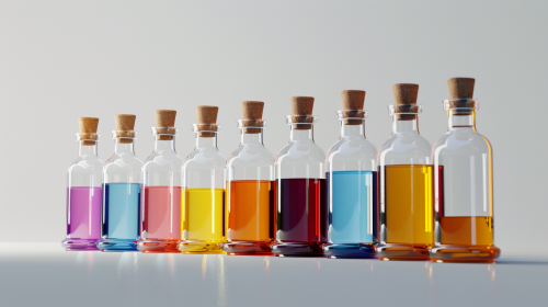 chemical bottles with different reaction phases, side view, ordered, symmetry --ar 16:9