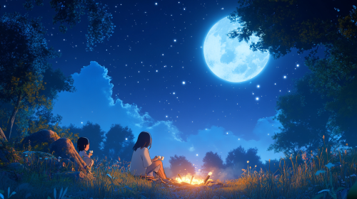 ghibli style, A cute girl is roasting marshmallows with her friends in the middle of a forest at night, under a beautiful moon and stars in the sky --ar 16:9