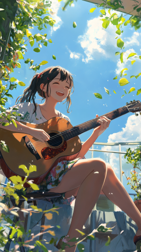 A happy girl plays the guitar, sitting on an open balcony with plants around her, smiling brightly against the backdrop of a blue sky. The light shines through the leaves onto her face, creating a warm atmosphere. The illustration style is a cute anime drawing, with soft colors and a dreamy feel. It captures the moment when she smiles while playing the guitar. --ar 9:16 --v 6.1