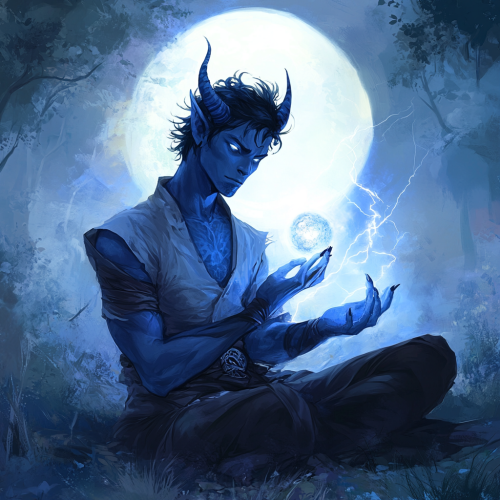 A young adult male Tiefling storm sorcerer sits in a serene wilderness under a bright moonlit sky, drawn in a clean, stylized anime-inspired art style with polished shading. His dark blue skin is lined with subtle ridges, enhancing his sharp, angular face. His short, tousled black hair frames his intense, brooding expression. His black horns curve upward, tapering into dark blue tips that match his skin. Pale blue eyes, glowing softly, are focused intently on an orb of crackling storm energy hovering above his hand. His devil-like tail curls lazily behind him. The lighting is soft and cool, with moonlight casting long shadows, while the glowing orb and arcs of electricity add dynamic highlights. The color palette is dominated by blues and subtle purples, creating a moody yet magical atmosphere, with smooth shading and precise line work typical of anime fantasy illustrations.