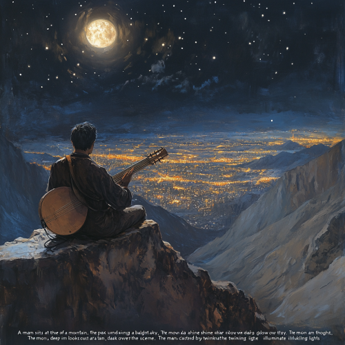 "A man sits at the peak of a mountain, playing a baÄŸlama under the dark night sky. The moon and stars shine brightly above, casting a soft glow over the scene. The man, deep in thought, looks out at a distant cityscape illuminated by the twinkling lights of the city below. The baÄŸlama's strings vibrate softly in the still night air, blending with the peaceful atmosphere. The landscape is serene, with the vast sky and twinkling stars creating a sense of quiet solitude."