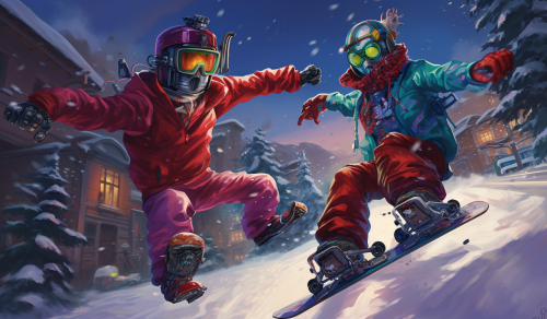 in a lively, colorful festive holiday scene, show a robot and a human snowboarding together wearing vibrant clothes --ar 31:18