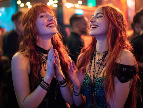 A photo of two women one with one with long red hair and the other in a black dress with an intricate blue pattern, laughing while they are outside of club. The atmosphere is warm and cozy, illuminated by soft lighting that casts gentle shadows on their faces as they smile while clapping each other's hands together. A close-up shot captures them in mid-dance, showcasing intricate details like beads on necklaces and reflections from sparkling lights. In the background are a line of people in club clothing.In the style of Annie Leibovitz. High resolution, 20k, hyper realistic, cinematic lighting, dramatic, close-up. --ar 4:3