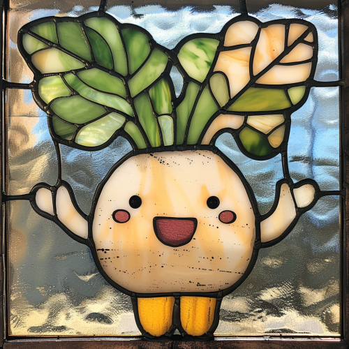 stained glass depicting an adorable turnip as an elemental bender, minimalist, cartoonish