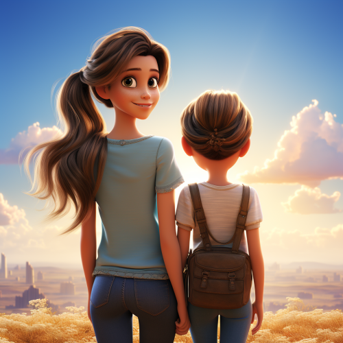 generate an image of a brunette mother and daughter looking at the glassed wall, view from behind, white background, wearing a blue t shirt, from the movie coco release on 2017, directed by Adrian Molina and Lee Unkrich, pixar animated features --v 5.2 --s 950 --style raw