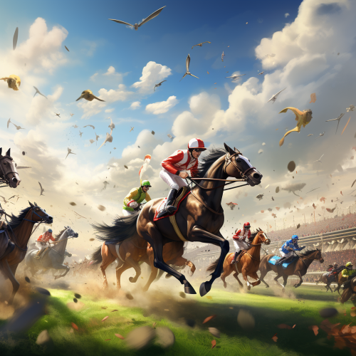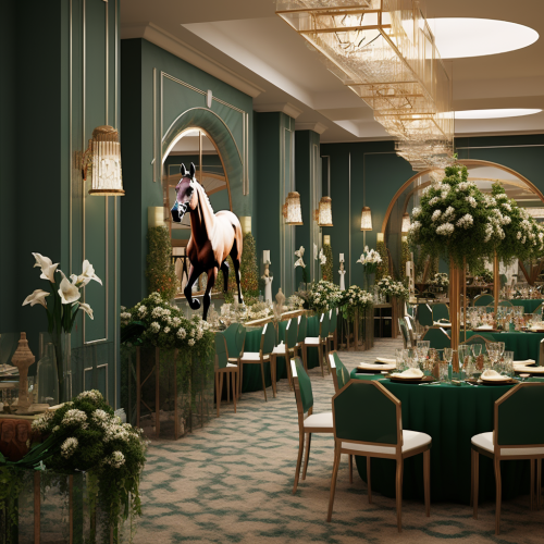 an hallroom for an horse racing event, room decorated with equestrian and ramadan theme, decor elements, photo booths, installations, standing arrangements, realistic, ramadan color theme
