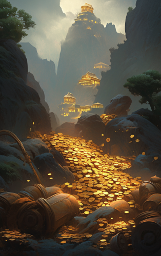 In the foreground, there is a towering golden mountain with a gold coin field filled with gold coins. The blue sky and a river in front of the mountain are filled with gold. Realistic photos - Original style - v6.0