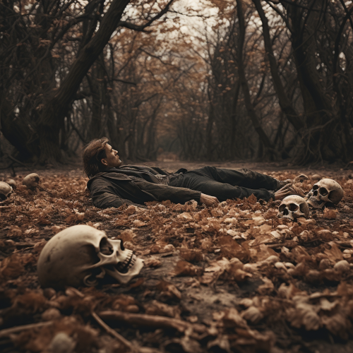 Person lying face down on the floor in an autumn park. The sky is overcast with heavy clouds. The leaves of the trees are made of bones. There are many bones underground, too.
