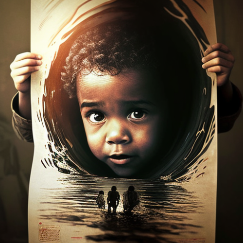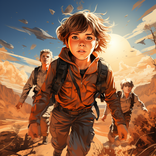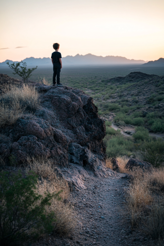 A movie poster style cinematic photograph of a small boy standing on top of a small, desert rock path, lit with the last light of the day, as if flmed by a 35mm lens, we see the vast empty sonoran desert around him, you can almost feel the heat from the image, dusty in the air, in the style of a movie poster, --ar 2:3