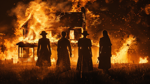 Movie poster for a western thriller film called HOMESTEAD using a Hyperrealistic Film still of a small 1800s homestead farmhouse on fire, the silhouettes of four different women watch their home burn, one is nine months pregnant, one is an amputee at her forearm on one hand, one is terrified, and one is crying, some hold guns, epic, scary, thriller, nighttime, Directed by Katheryn Bigelow. Shot on Arri Alexa. Cinematic. Color. 32k. --style raw --ar 16:9
