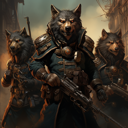 **Grimdark steampunk death squad of enormous werewolf gunmen, dark fantasy, digital art, masterpiece painting, ultra detailed, ultra high definition, 8K resolution, heavy shading, superior quality, cover illustration, complex design, steampunk gear highlights, rich vibrant colours, hyperrealistic, meticulously hyper detailed, artstation