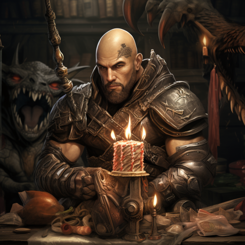birthday picture for Drago human master of dragons in fantasy world wildemount, he is muscular with a bald head and a black beard, fantasy style
