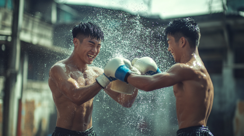 two asian boxers in the heat, one is throwing a bucket of water on the other one, fighting stance, side view, full body side pov, happy smile, natural photography, moody scene, realisticphoto, clean style, Sony, 8k, --ar 16:9