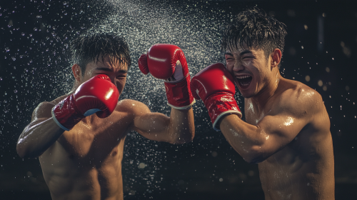 two asian boxers in the heat, one is throwing a bucket on the other one, fighting stance, side view, full body side pov, happy smile, natural photography, moody scene, realistic photo, clean style, the boxer on the right is closer to the screen, Sony, 8k, --ar 16:9 --v 6.1