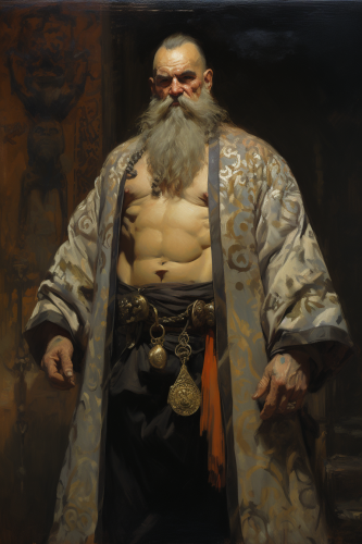 portrait of a muscular bold dwarf covered in tattoos wearing a robe by frank frazetta --ar 2:3