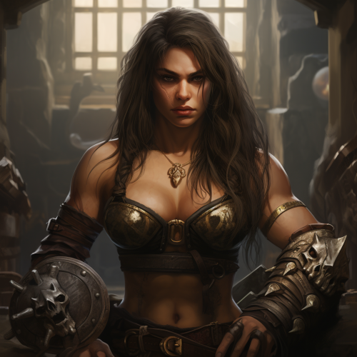 female dwarf, stocky, black hair, dungeons and dragons, hammer, muscular