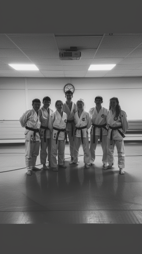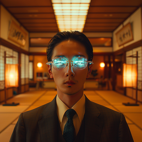a real photo,A young Japanese salaryman in a business suit stands in a traditional karate dojo. He's connected to futuristic devices with blinking lights attached to his temples, directly downloading karate knowledge into his brain, reminiscent of a scene from The Matrix. The dojo, adorned with wooden floors and ancient scrolls, creates a striking contrast between tradition and modern technology. The early morning sunlight filters through shoji screens, illuminating the scene with a soft glow. --style raw --s 750 --v 6.0