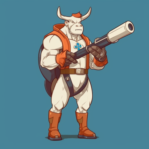 humanoid cow holding a bazooka. strong muscle man physique of a cow man. cartoon. anime --s 750 --v 5.1