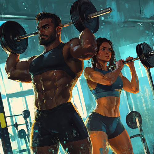 Description: A vibrant scene of a gym full of life and energy. In the foreground, a man and woman with athletic and defined physiques are performing a free weight exercise, such as barbell lifting or deep squats, showing effort and concentration. The faces of both must convey determination, with drops of sweat falling, while their muscles tense up from the intensity of the exercise. --v 6.1