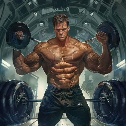 Pictures of a baby Tom Brady in a masculine body Lifting weights and getting swole in a futuristic backround --s 50
