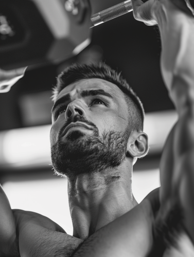 "Young athletic man in a modern gym, lifting weights with intense focus, wearing a sleeveless workout shirt, dynamic angles, vibrant lighting, Instagram-style photography."