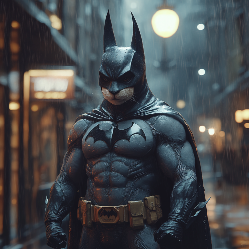 "Create a hyper-realistic image of a rabbit dressed as Batman, very muscular bodybuilder style with the black costume of the batman, black cape and the symbol of the batman highlighted on his chest. The animal must be placed with confidence, square face of transformation of man erodes rabbit and evil face in the center of a city in the center of gothan city on top and a building like in the series . The costume must be adapted to suit the animal naturally, with detailed textures that blend with the skin or fur, and show realistic folds and lighting effects that highlight your muscles. The black coat should flow naturally behind the animal, capturing light and adding a sense of movement. The background includes a superhero series scenario elements like a rainy night, enhancing the atmosphere. The overall picture should be sharp, detailed and photorealistic, combining the heroic essence of batman with the night environment --s 750 --v 6.1