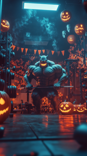 A Halloween monster working out in a dimly lit gym decorated with spooky Halloween elements. The monster is muscular and fierce but has a humorous, friendly look, lifting heavy weights or using gym equipment. The gym is filled with Halloween decor: glowing jack-o'-lanterns, cobwebs in the corners, eerie candles on the shelves, and creepy banners hanging from the walls. A misty, dark atmosphere surrounds the scene, with shadows adding a mysterious vibe. The monster’s expression is determined and fun, fitting the Halloween theme perfectly. Dark cinematic lighting, highly detailed, creepy yet playful. --ar 9:16
