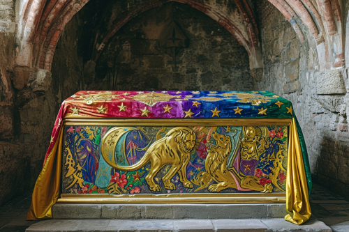 a gold sarcophagus without a lid depicting moons, stars, lions, and dragons resting on a dais covered in colorful silks in in a medieval European castle's courtyard. Realistic colored ink. --ar 9:6 --v 6.0