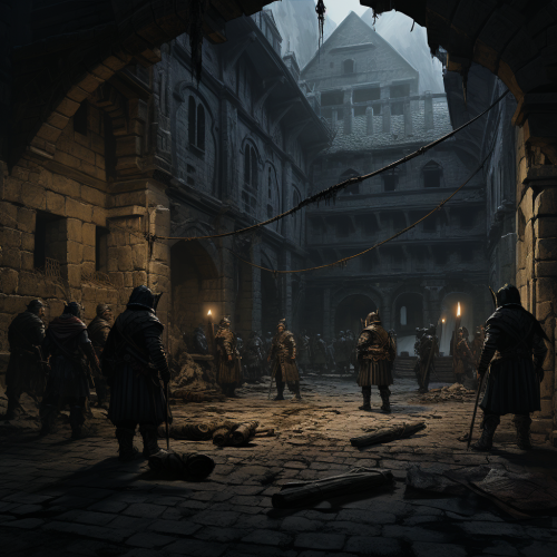 medieval german soldiers training in a stone courtyard, dark fantasy